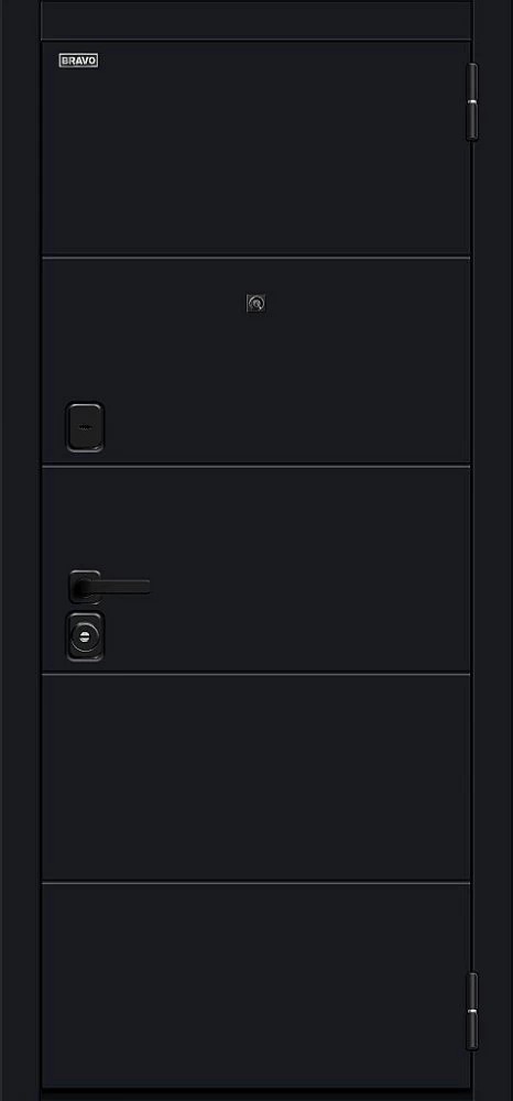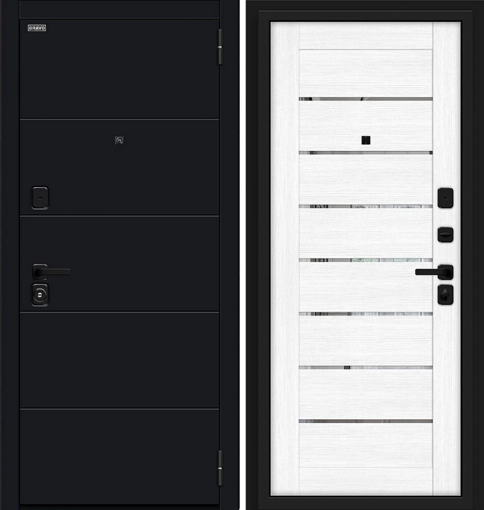 Надежная входная Дверь Браво Прайд Total Black/Snow Melinga премиум класса по цене 40 110 руб. Большая толщина стали защитит от проникновения в ваш дом, квартиру или коттедж. Используется очень качественная фурнитура: замки, цилиндры, ручки, защелки. Покрытие и отделка двери изготовлено под внимательным контролем производителя. Дверь имеет долгий срок службы и гарантию.